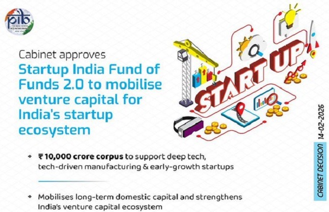 प्रधानमंत्री नरेन्द्र मोदी की अध्यक्षता में केंद्रीय मंत्रिमंडल ने शनिवार को देश के स्टार्टअप इकोसिस्टम के लिए वेंचर कैपिटल जुटाने के उद्देश्य से 10 हजार करोड़ रुपये कोष के साथ स्टार्टअप इंडिया फंड ऑफ फंड्स 2.0 की स्थापना को मंजूरी दे दी।