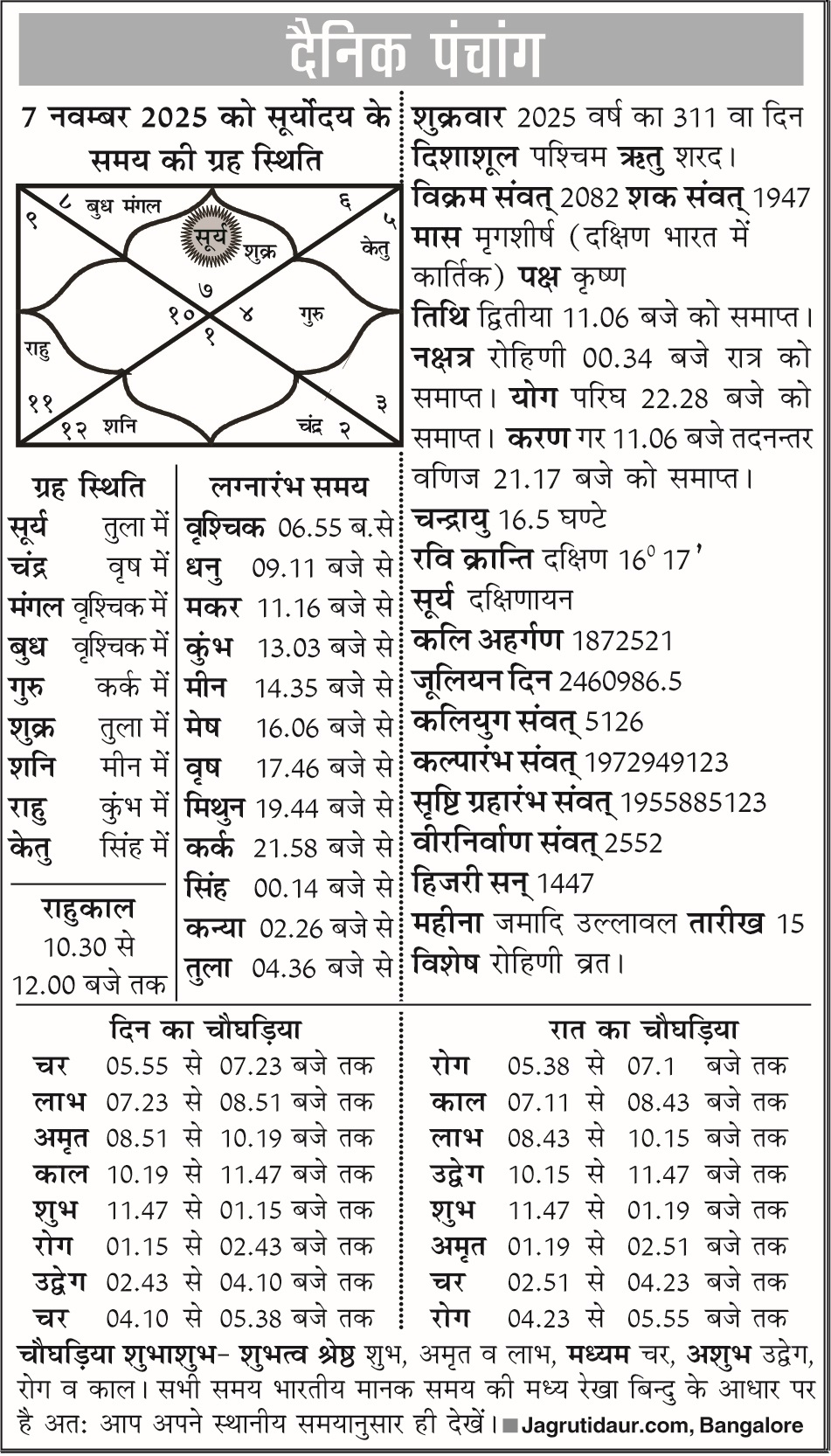 07 नवम्बर 2025 को सूर्योदय के समय की ग्रह स्थिति ग्रह स्थिति सूर्य तुला में चंद्र वृष में मंगल वृश्चिक में बुध वृश्चिक में गुरु कर्क में शुक्र तुला में शनि मीन में राहु कुंभ में केतु सिंह में लग्नारंभ समय वृश्चिक 06.55 ब.से धनु 09.11 बजे से मकर 11.16 बजे से कुंभ 13.03 बजे से मीन 14.35 बजेे से मेष 16.06 बजे से वृष 17.46 बजे से मिथुन 19.44 बजे से कर्क 21.58 बजे से सिंह 00.14 बजे से कन्या 02.26 बजे से तुला 04.36 बजे से शुक्रवार 2025 वर्ष का 311 वा दिन दिशाशूल पश्चिम ऋतु शरद। विक्रम संवत् 2082 शक संवत् 1947 मास मृगशीर्ष (दक्षिण भारत में कार्तिक) पक्ष कृष्ण तिथि द्वितीया 11.06 बजे को समाप्त। नक्षत्र रोहिणी 00.34 बजे रात्र को समाप्त। योग परिघ 22.28 बजे को समाप्त। करण गर 11.06 बजेे तदनन्तर वणिज 21.17 बजे को समाप्त। चन्द्रायु 16.5 घण्टे रवि क्रान्ति दक्षिण 160 17Ó सूर्य दक्षिणायन कलि अहर्गण 1872521