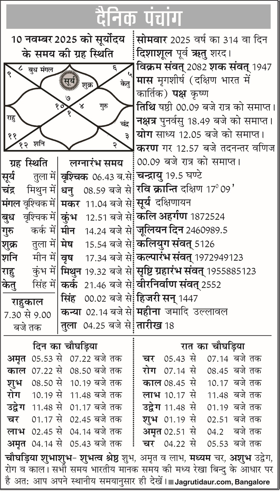 10 नवम्बर 2025 को सूर्योदय के समय की ग्रह स्थिति ग्रह स्थिति सूर्य तुला में चंद्र मिथुन में मंगल वृश्चिक में बुध वृश्चिक में गुरु कर्क में शुक्र तुला में शनि मीन में राहु कुंभ में केतु सिंह में लग्नारंभ समय वृश्चिक 06.43 बजे से धनु 08.59 बजे से मकर 11.04 बजे से कुंभ 12.51 बजे से मीन 14.24 बजेे से मेष 15.54 बजे से वृष 17.34 बजे से मिथुन 19.32 बजे से कर्क 21.46 बजे से सिंह 00.02 बजे से कन्या 02.14 बजे से तुला 04.25 बजे से