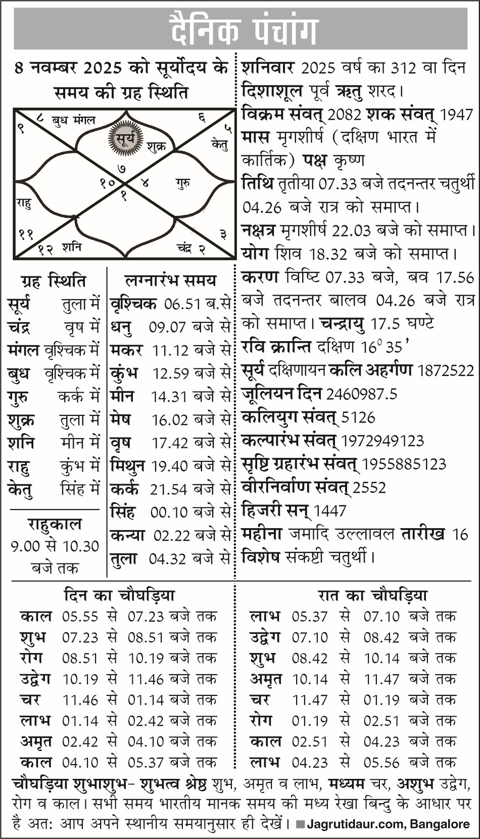 8 नवम्बर 2025 को सूर्योदय के समय की ग्रह स्थिति ग्रह स्थिति सूर्य तुला में चंद्र वृष में मंगल वृश्चिक में बुध वृश्चिक में गुरु कर्क में शुक्र तुला में शनि मीन में राहु कुंभ में केतु सिंह में लग्नारंभ समय वृश्चिक 06.51 ब.से धनु 09.07 बजे से मकर 11.12 बजे से कुंभ 12.59 बजे से मीन 14.31 बजेे से मेष 16.02 बजे से वृष 17.42 बजे से मिथुन 19.40 बजे से कर्क 21.54 बजे से सिंह 00.10 बजे से